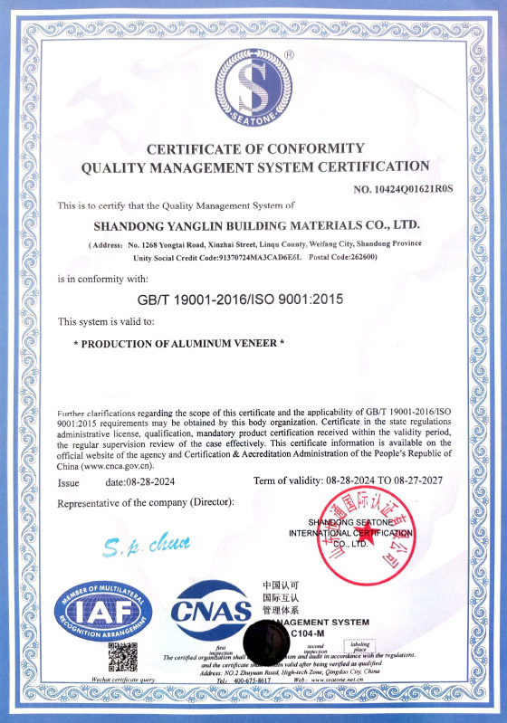 Our products comply with the standards of GB/T23443-2009 for aluminum veneer for architectural decoration, GB/T23444-2009 for metal and metal composite ceiling panels, GB/T5237-2017 for aluminum alloy architectural profiles, and AAMA2605 for American Manufacturing Association.